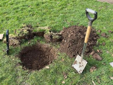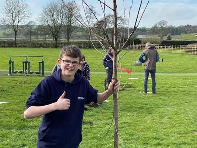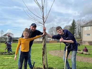 Here am I with my eldest son and daughter making sure our tree is straight and well nourished after planting, while my youngest son has a well earned hot chocolate after all the digging!